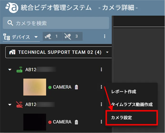 対象のカメラの横のアイコンをクリックし、[ カメラ設定 ] をクリックします。