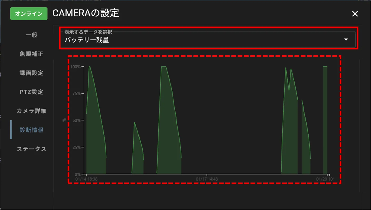 「 診断情報 」タブにて、「 表示するデータを選択 」というプルダウンから、[ バッテリー残量 ]を選択します。