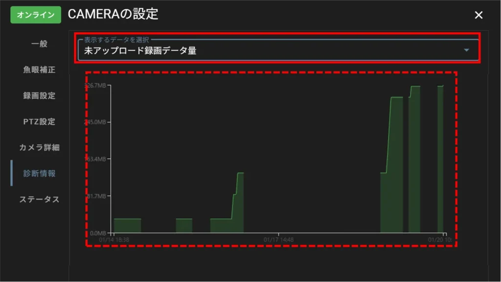 「 診断情報 」タブにて、「 表示するデータを選択 」というプルダウンから、[ 未アップロード録画データ量 ]を選択します。
