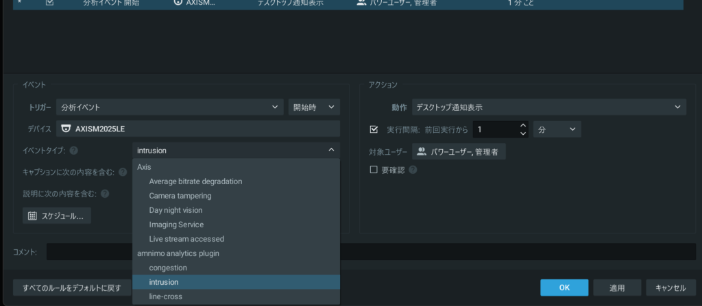 「 イベントタイプ 」欄をクリックし、ユースケース種別(「 カメラ設定 」画面で設定)に応じたイベントタイプを以下から選択します。