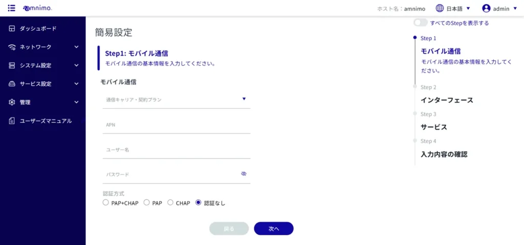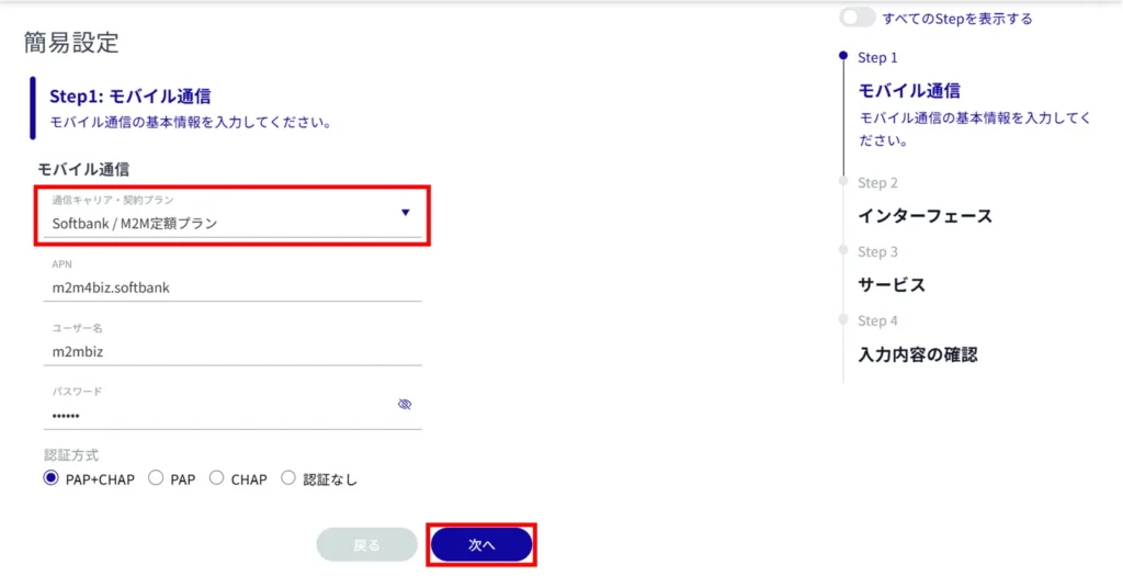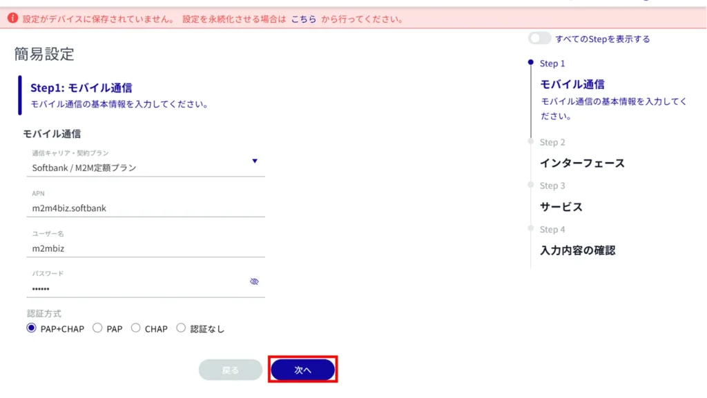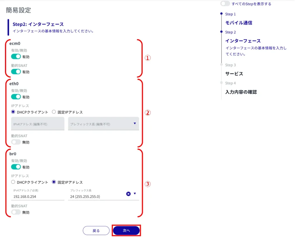 モバイル接続設定が不要の場合は、そのまま[ 次へ ]をクリックし、インターフェースの設定に進んでください。