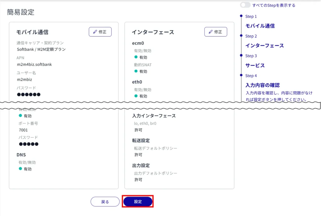 - 通信モジュール非搭載モデルの IoT ルーター(AR10-000JP)をご利用の場合、「 簡易設定 」画面は表示されません。