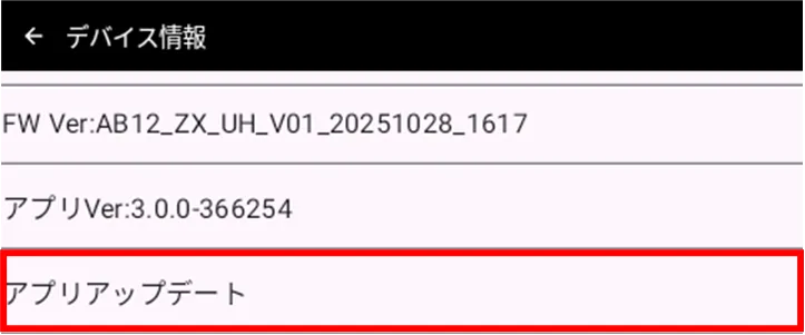「 デバイス情報 」画面にて、[ アプリアップデート ]をタップします。