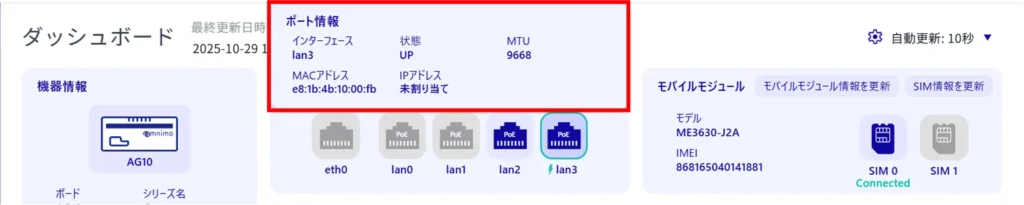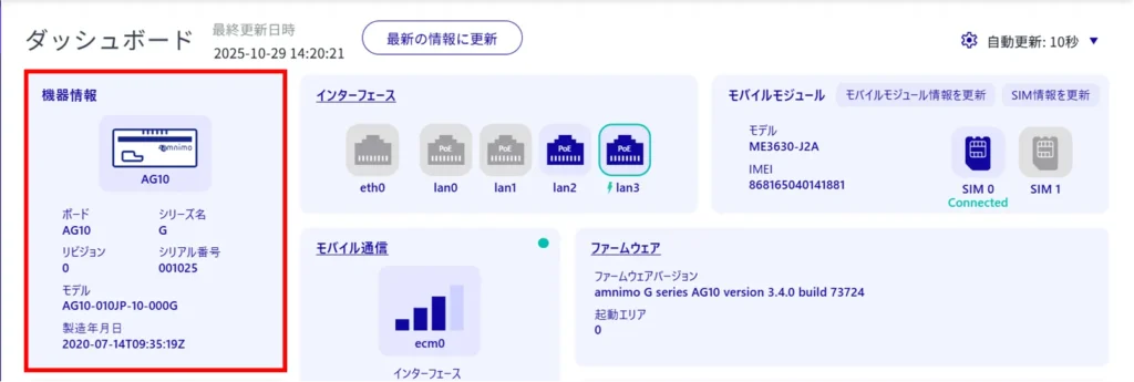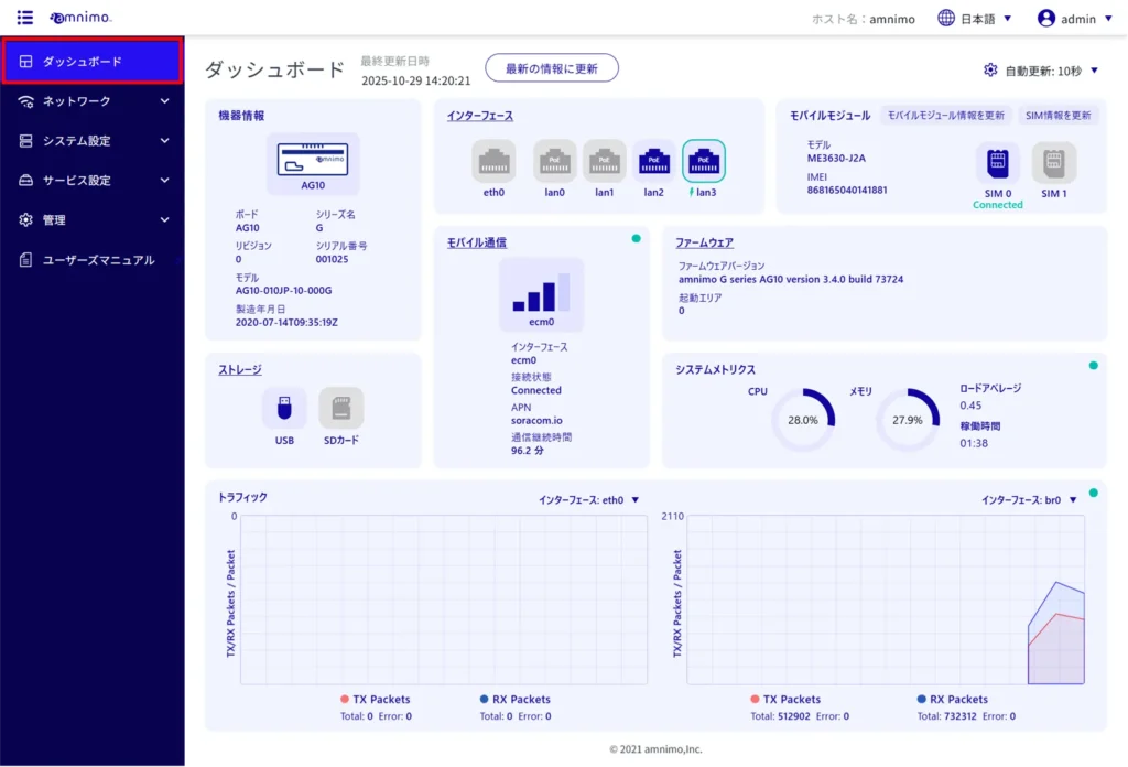(以下の画像は、屋内版エッジゲートウェイ(AG10)のダッシュボードです。ご利用のデバイスの機種により、ダッシュボードに掲載される要素は異なります。)