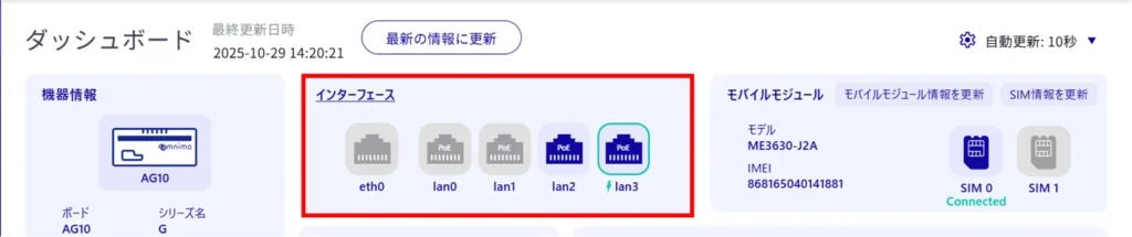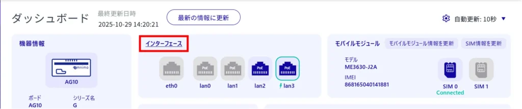 「 インターフェース 」では、インターフェースのリンク状況をはじめとした各ポートの情報を確認することができます。
