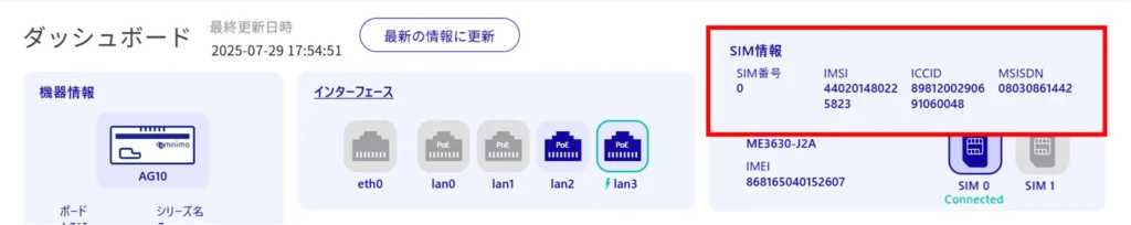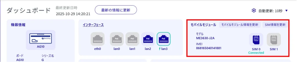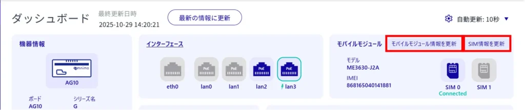 [ モバイルモジュール情報を更新 ]と[ SIM 情報を更新 ]をそれぞれクリックすると、モバイルモジュールと SIM の情報の更新ができます。