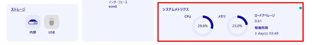 「 システムメトリックス 」では、CPU とメモリの使用率およびロードアベレージ、稼働時間が確認できます。