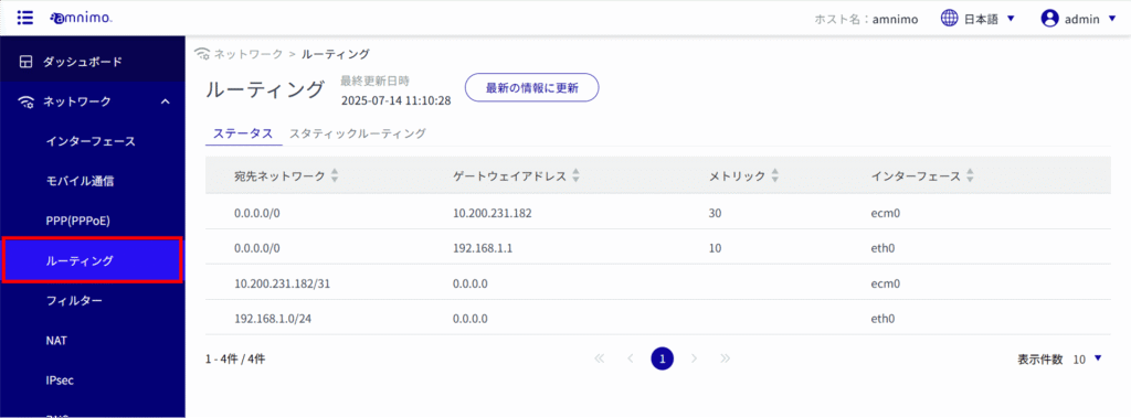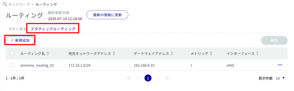 サイドメニューの[ ネットワーク ]>[ ルーティング ]をクリックすると、「 ルーティング 」画面を開くことができます。