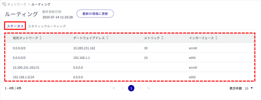 「 ステータス 」タブを開くと、ルーティングテーブルの情報(ルーティング処理の際に参照される経路情報)を確認することができます。