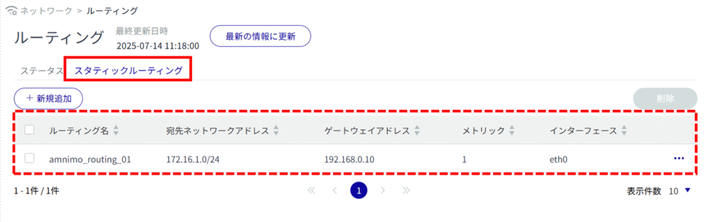 「 スタティックルーティング 」タブを開くと、スタティックルーティング設定の一覧が表示されます。