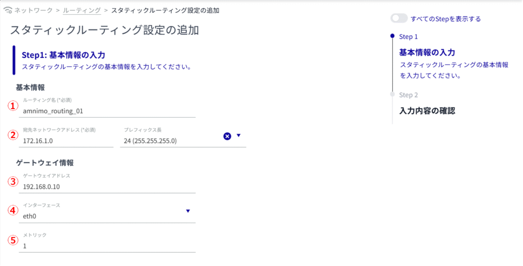 スタティックルーティングの基本情報について、以下①~⑤を設定し[ 次へ ]をクリックします。