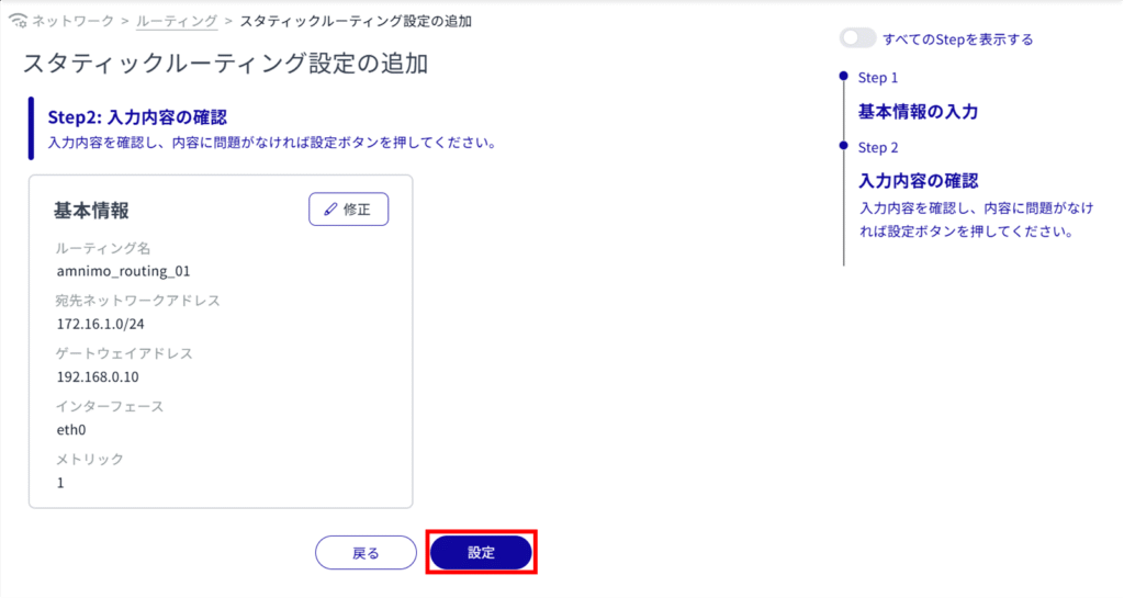 「 スタティックルーティング設定の編集 」画面で設定を行い、[ 設定 ]をクリックすると、スタティックルーティング設定の編集が完了します。