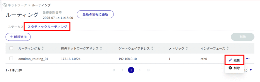 「 スタティックルーティング 」タブにて、編集したいスタティックルーティング設定の右に表示されている[…]をクリックし、表示された操作メニューから[ 編集 ]を選択します。