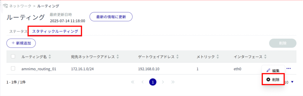 「 スタティックルーティング 」タブにて、削除したいスタティックルーティング設定の右に表示されている[…]をクリックし、表示された操作メニューから[ 削除 ]を選択します。