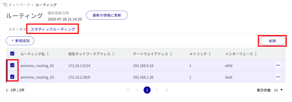 複数のスタティックルーティング設定を一括で削除する際に便利です。スタティックルーティング設定を1つだけ選択して削除することもできます。