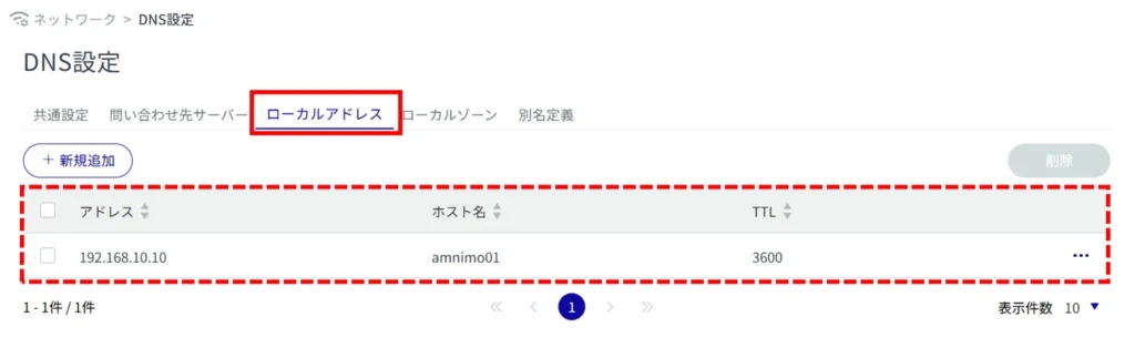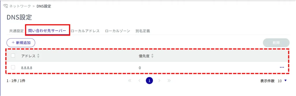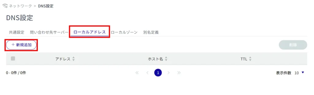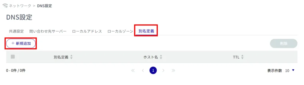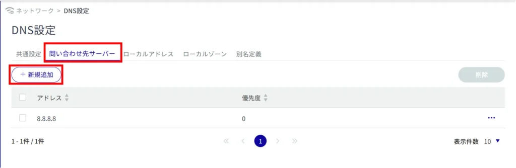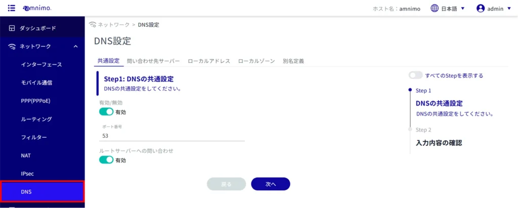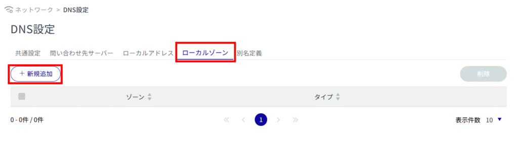 サイドメニューの[ ネットワーク ]>[ DNS 設定 ]をクリックすると、「 DNS 設定 」画面を開くことができます。