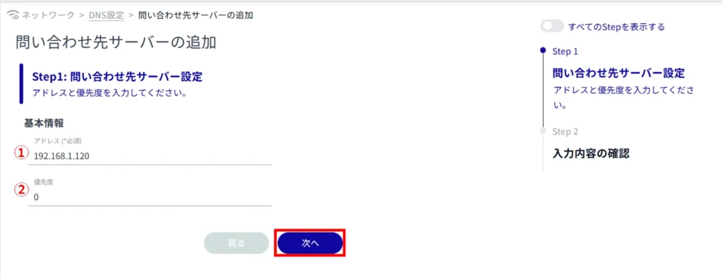 ① 問い合わせ先の上位 DNS サーバーを指定します。