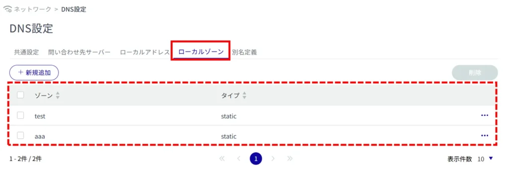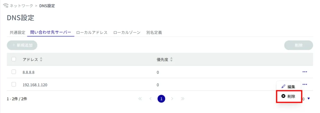 登録されている DNS 設定の削除には、各 DNS 設定の操作メニューから個別に削除する方法と、複数の対象を選択してから削除する方法があります。