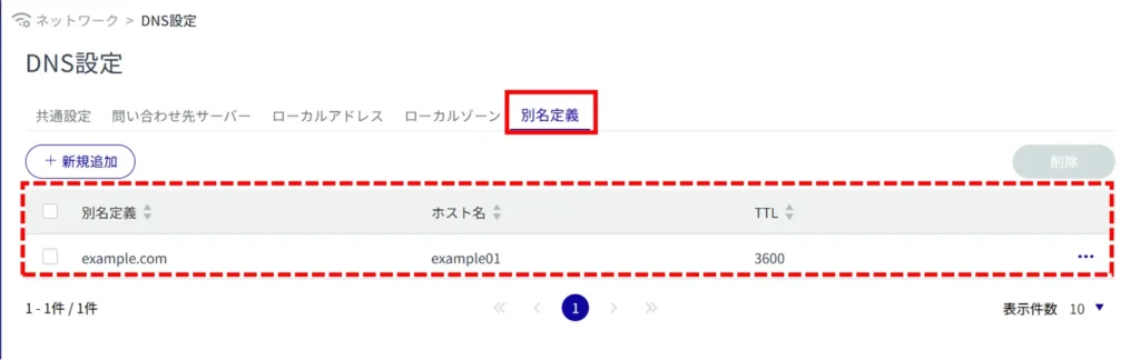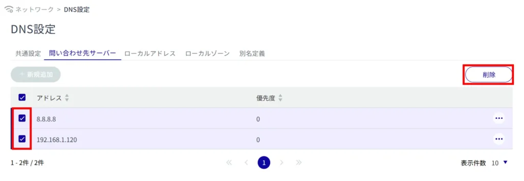 削除したい DNS 設定にチェックを付けてから削除する方法です。複数のDNS 設定を一括で削除する際に便利です。