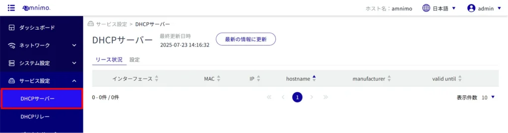 サイドメニューの[ サービス設定 ]>[ DHCP サーバー ]をクリックすると、「 DHCP サーバー 」画面を開くことができます。