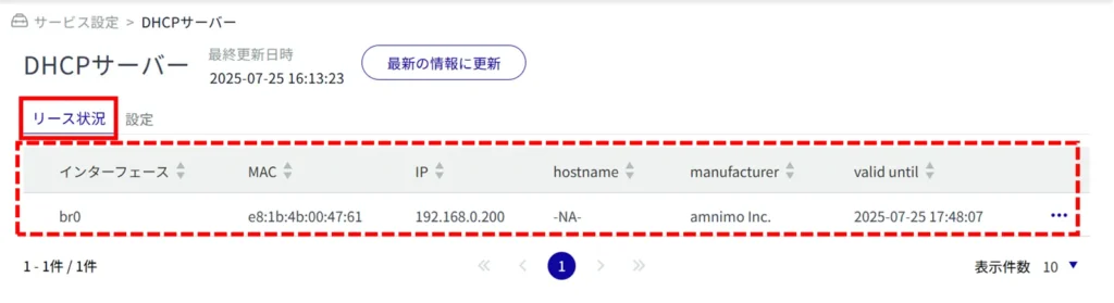 「 リース状況 」タブを開くと、DHCP サーバー設定したインターフェースからリースされている、IPアドレスの状況を表示することができます。