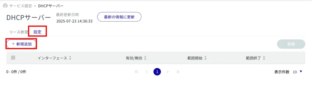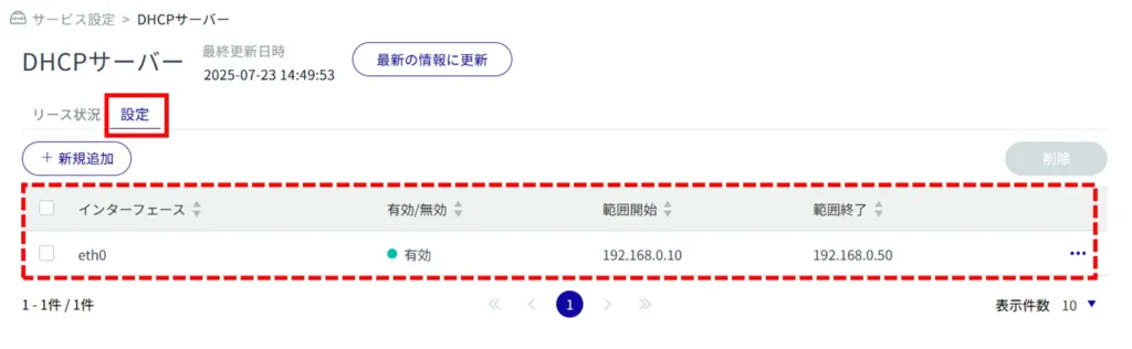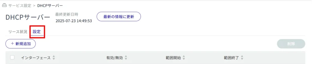 「 設定 」タブをクリックすると、DHCP サーバーの設定一覧を表示することができます。
