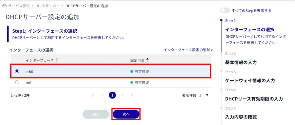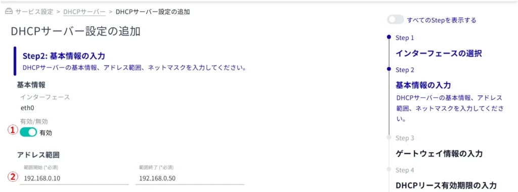 この機能を使用するためには、該当のインターフェースにおけるDHCPサーバー設定が必要です。 設定方法については、以下を参照してください。