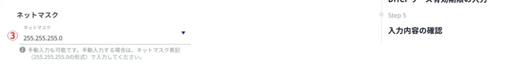 ③ サブネットマスクを指定します。デフォルト値は255.255.255.0です。