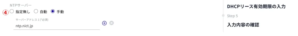 ④ DHCP クライアントに通知する NTP サーバーの IP アドレス(IPv4)を指定します。