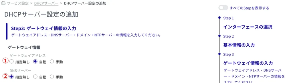 ① DHCP クライアント側へ通知するゲートウェイアドレスを指定します。