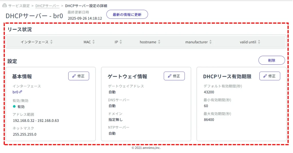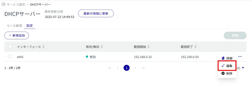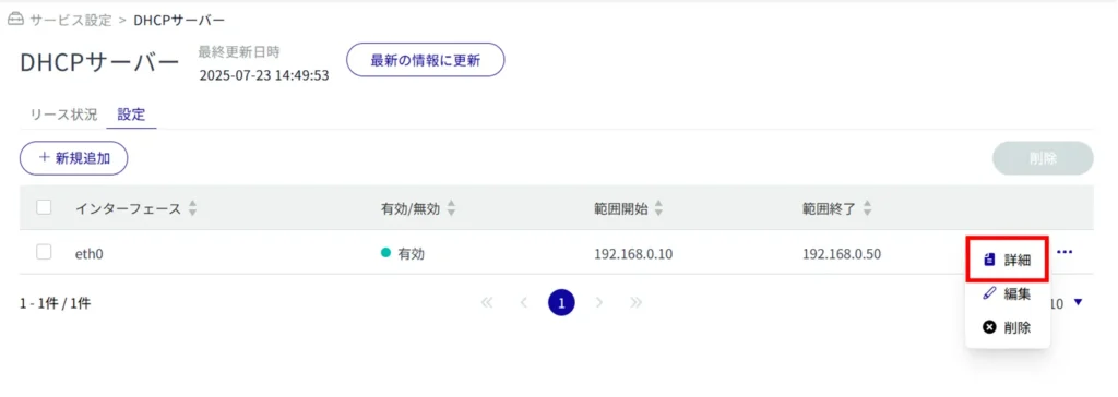 ここでは、DHCP サーバーのリース状況の確認や、設定の追加、編集、削除を行うことができます。