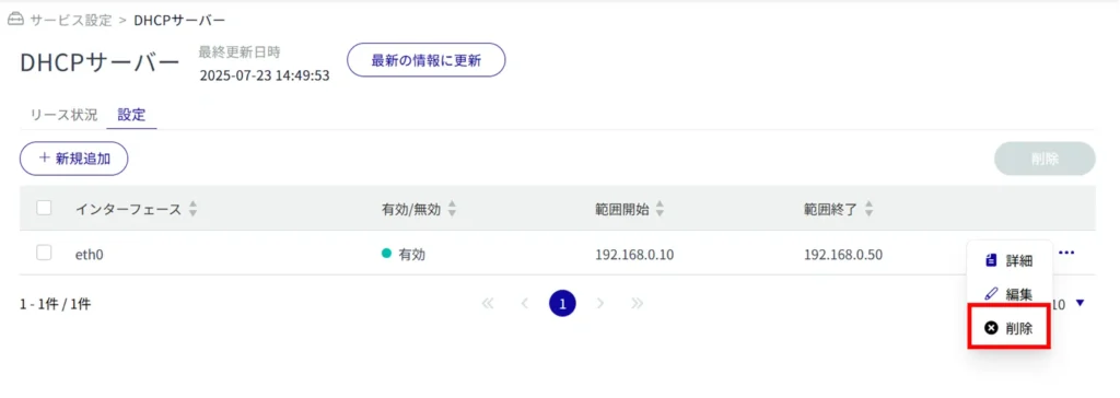 DHCPサーバー設定を1つだけ選択して削除することもできます。