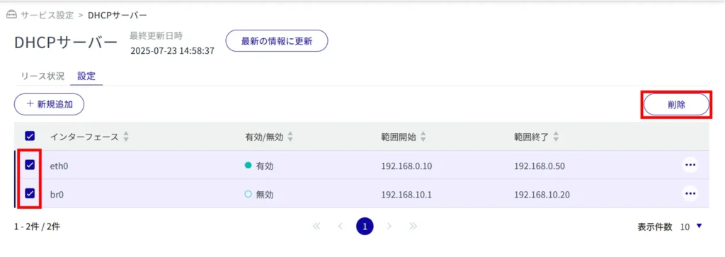 削除したいDHCPサーバー設定にチェックを付けてから削除する方法です。複数のDHCPサーバー設定を一括で削除する際に便利です。