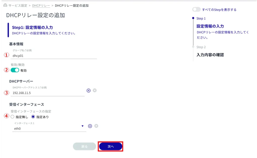 DHCP リレーの設定情報について、以下の①~④を設定し[ 次へ ]をクリックします。