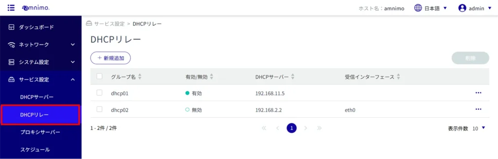 サイドメニューの[ サービス設定 ]>[ DHCP リレー ]をクリックすると、「 DHCP リレー 」画面を開くことができます。