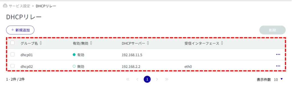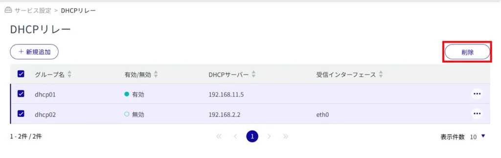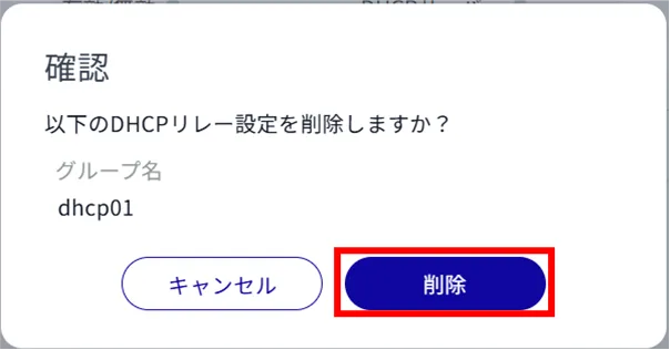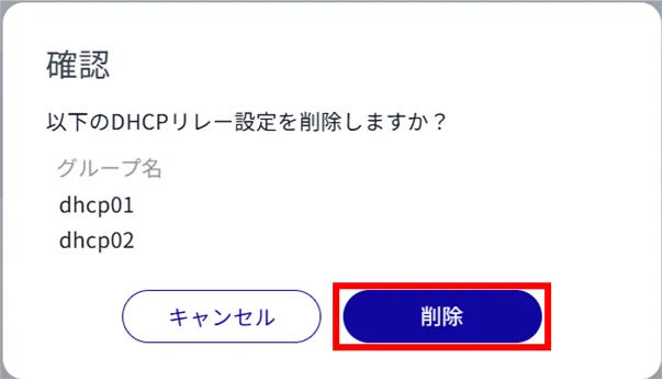 削除したい DHCP リレー設定の左に表示されているチェックボックスをクリックしてチェックマークを付け、[ 削除 ]をクリックします。