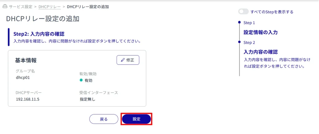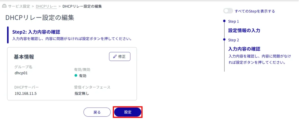「 DHCP リレー設定の編集 」画面で設定を行い、[ 設定 ]をクリックすると、DHCP リレー設定の編集が完了します。