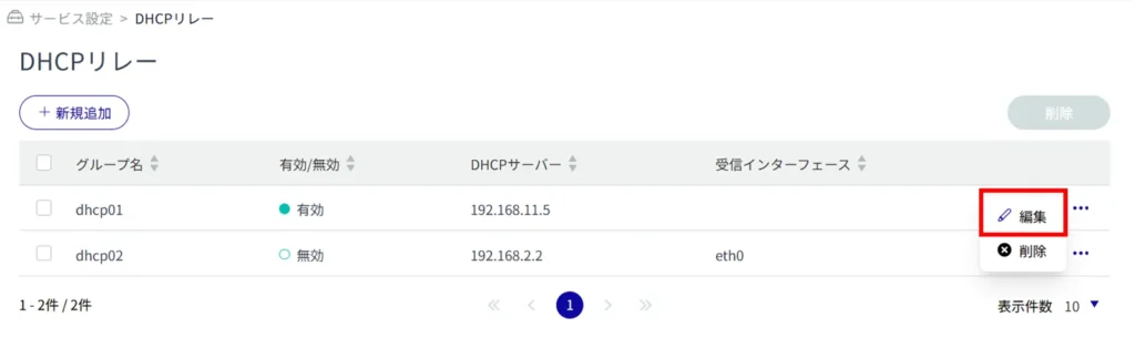 編集したい DHCP リレー設定の右に表示されている[…]をクリックし、表示された操作メニューから[ 編集 ]を選択します。
