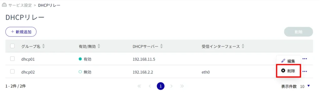 削除したい DHCP リレー設定の右に表示されている[…]をクリックし、表示された操作メニューから[ 削除 ]を選択します。