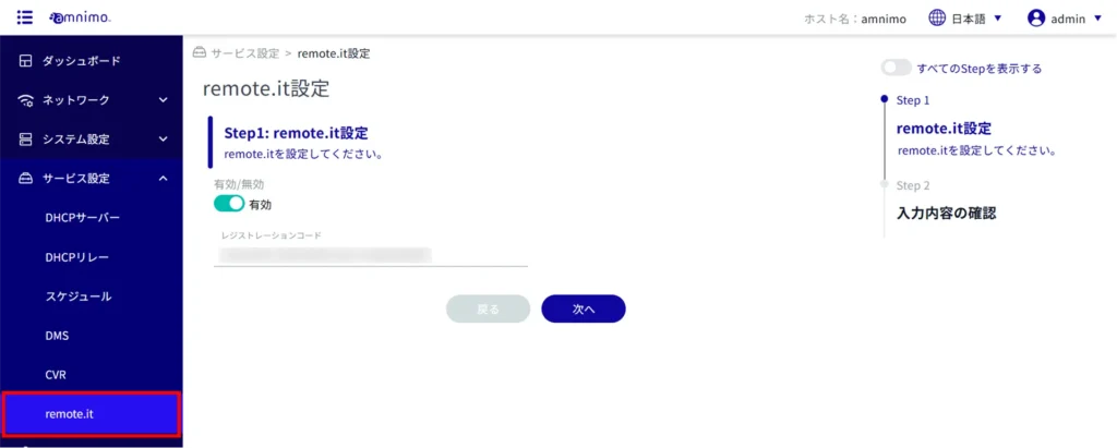 サイドメニューの[ サービス設定]>[ remote.it ]をクリックすると、「 remote.it 設定 」画面を開くことができます。