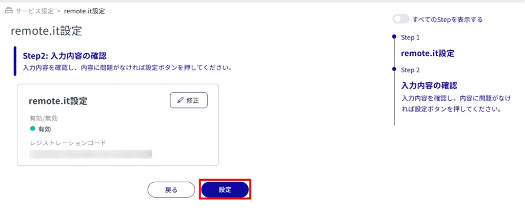 「 remote.it 設定 」画面に、現在の remote.it 設定の状況が表示されます。