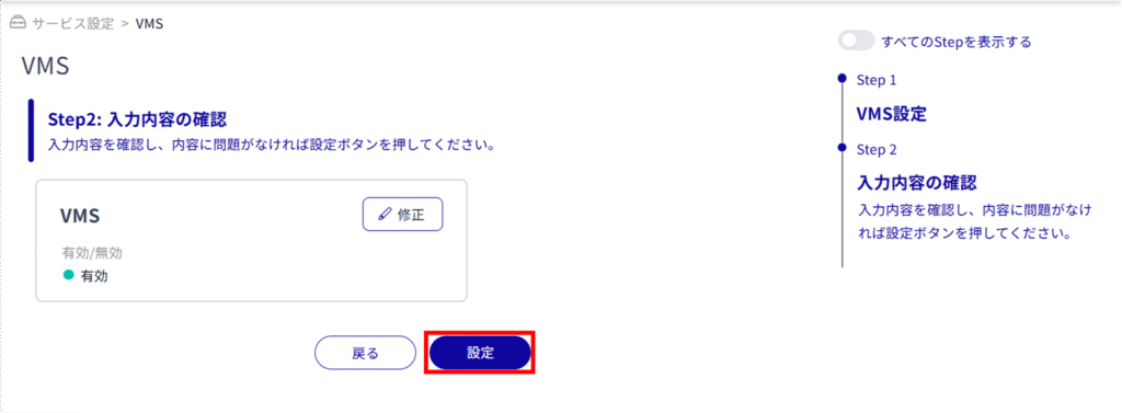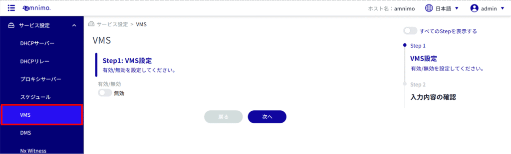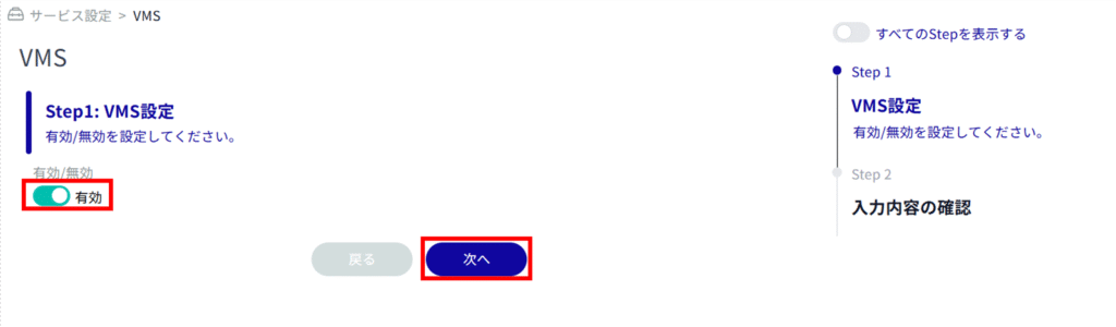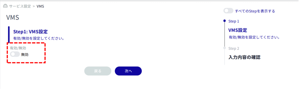 サイドメニューの[サービス設定 ]>[ VMS ]をクリックすると、「 VMS 」画面を開くことができます。