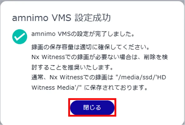 Nx Witness が有効となっている状態で、VMS を有効化させた場合、以下の表示が出るため [ 設定 ] をクリックします。