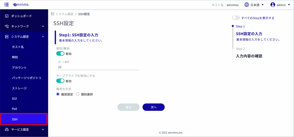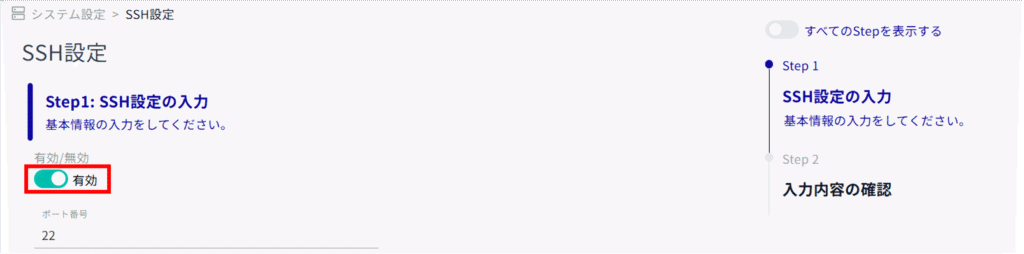 サイドメニューの[ システム設定 ]>[ SSH ]をクリックすると、「 SSH設定 」画面を開くことができます。
