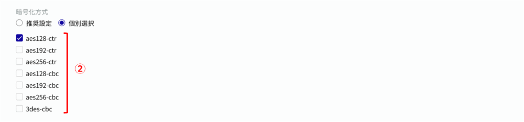 ② ①で[ 個別選択 ]を選択した場合は、使用する暗号化方式にチェックを付けます。