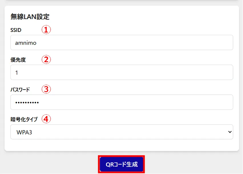無線 LAN 設定として、以下の①~④を設定し、[ QR コード生成 ]をクリックします。