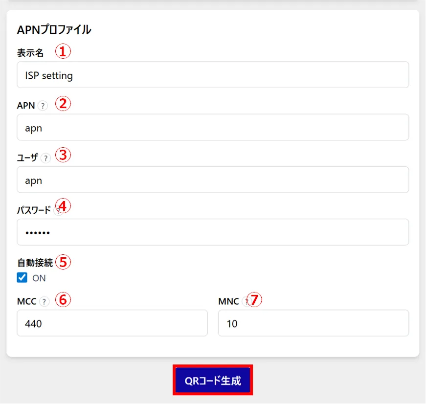 APN プロファイルについて、以下の①~④を設定し[ QR コード生成 ]をクリックします。