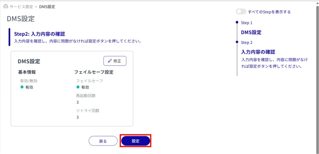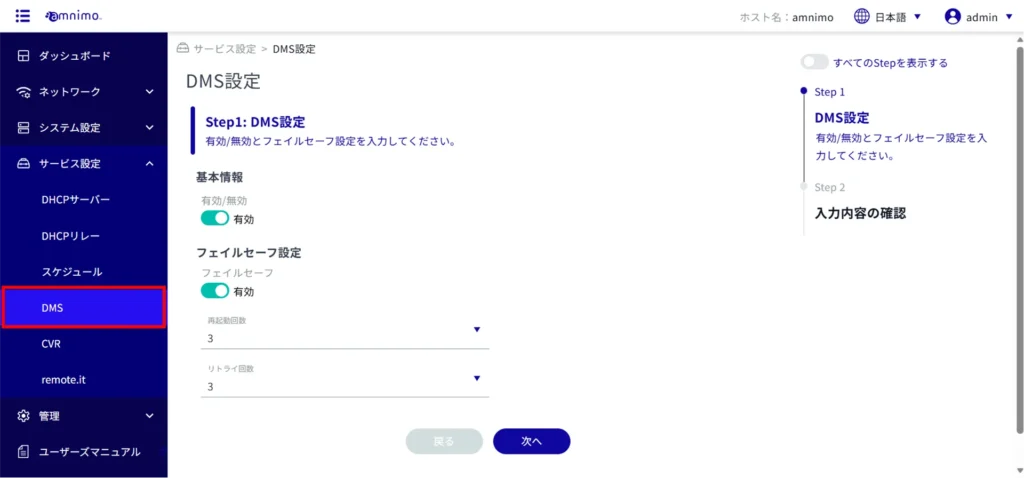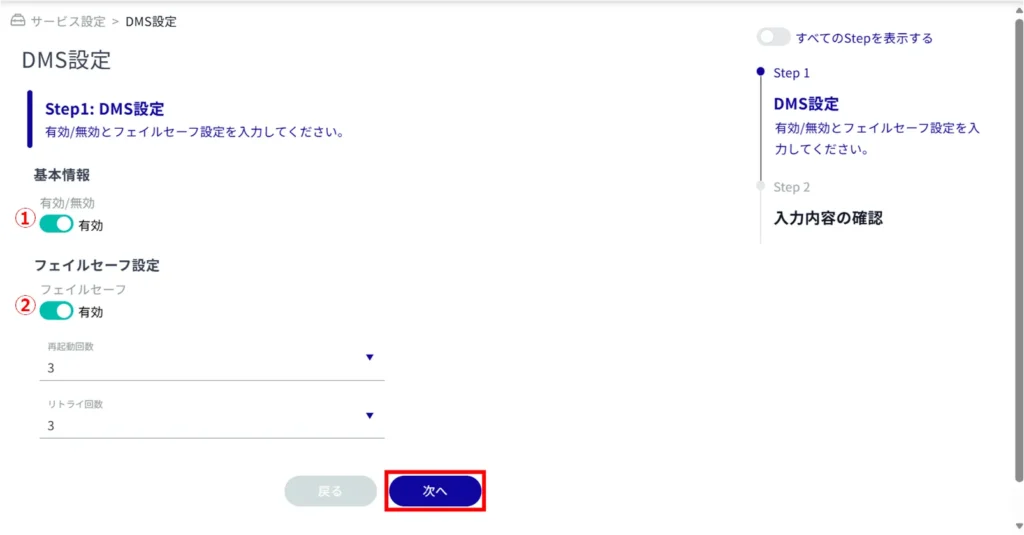① トグルをクリックし、DMS の有効 / 無効 を選択します。