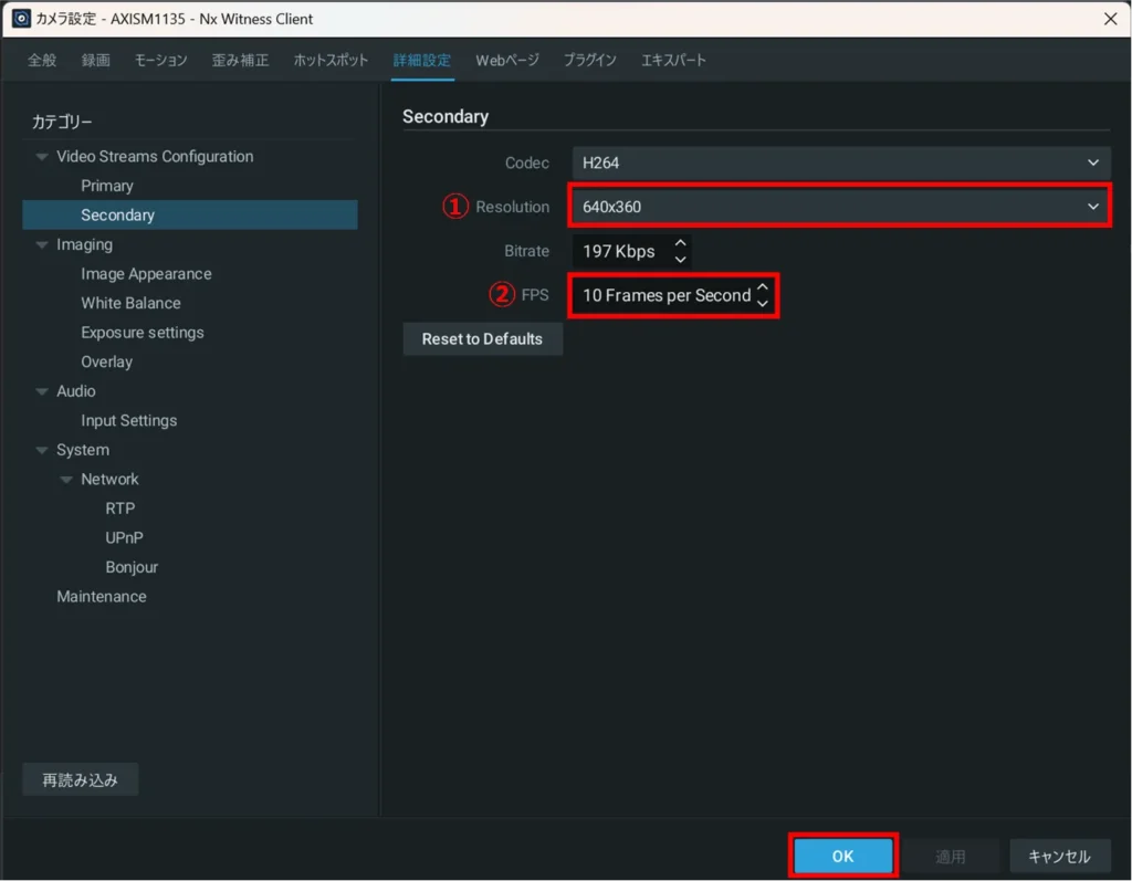 Secondary Stream について以下の①~②を設定し、[ OK ]をクリックします。