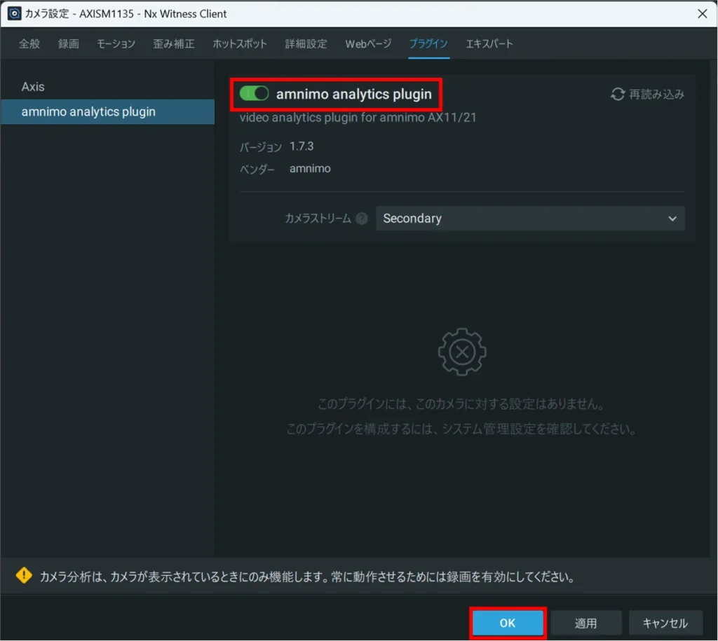 「 amnimo analytics plugin 」のトグルをクリックし、[ OK ]をクリックします。